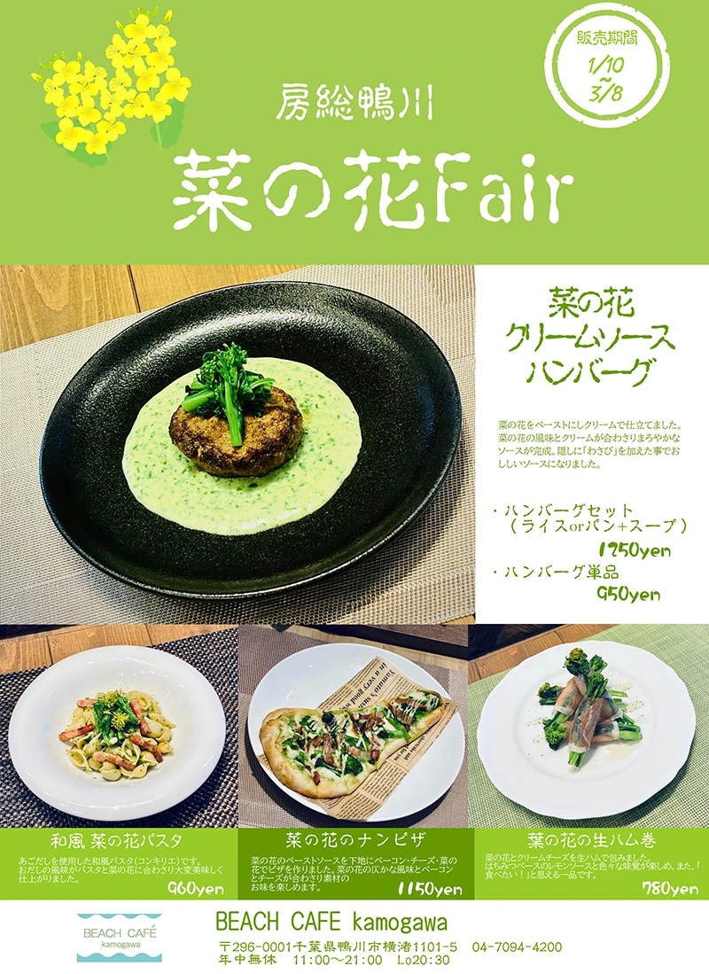 菜の花ハンバーグ、菜の花パスタ、菜の花ピザ、菜の花生ハム巻き ビーチ カフェ 鴨川