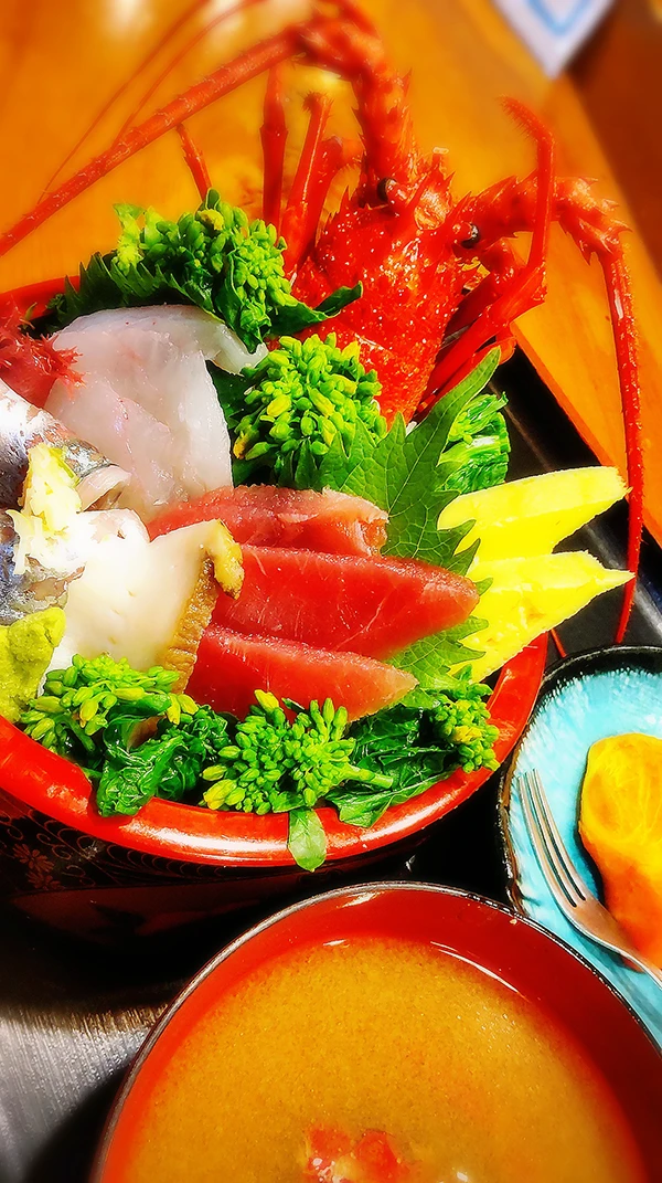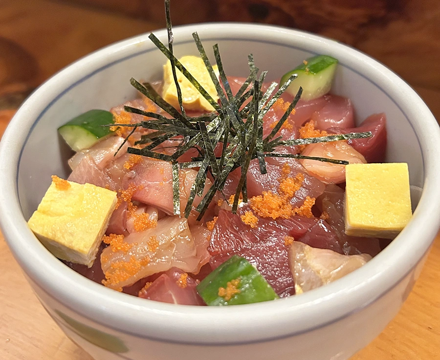 ブリ、鯛、マグロなど数種類の魚を贅沢に使用し、大小様々な大きさのサイコロ状にカットすることでバラエティ豊富な食感も楽しめる丼!季節によってマンボウも使用しています!海鮮の宝探し、やってみませんか?