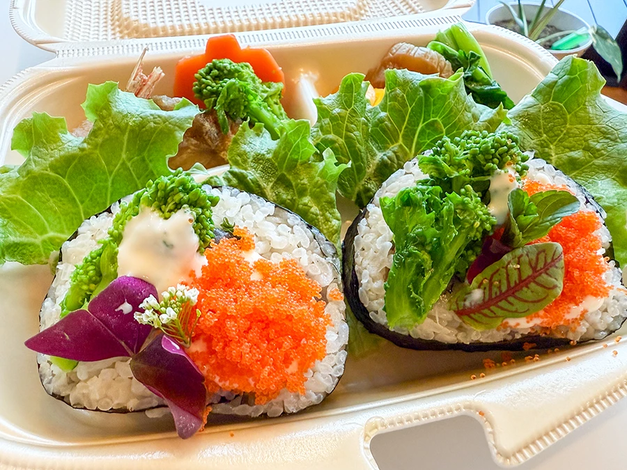 菜の花ロール、アラ煮、漬物付 菜の花と新鮮な鴨川の魚介を使用したサラダ風太巻き。お子様でも食べやすい味付けとなっております。