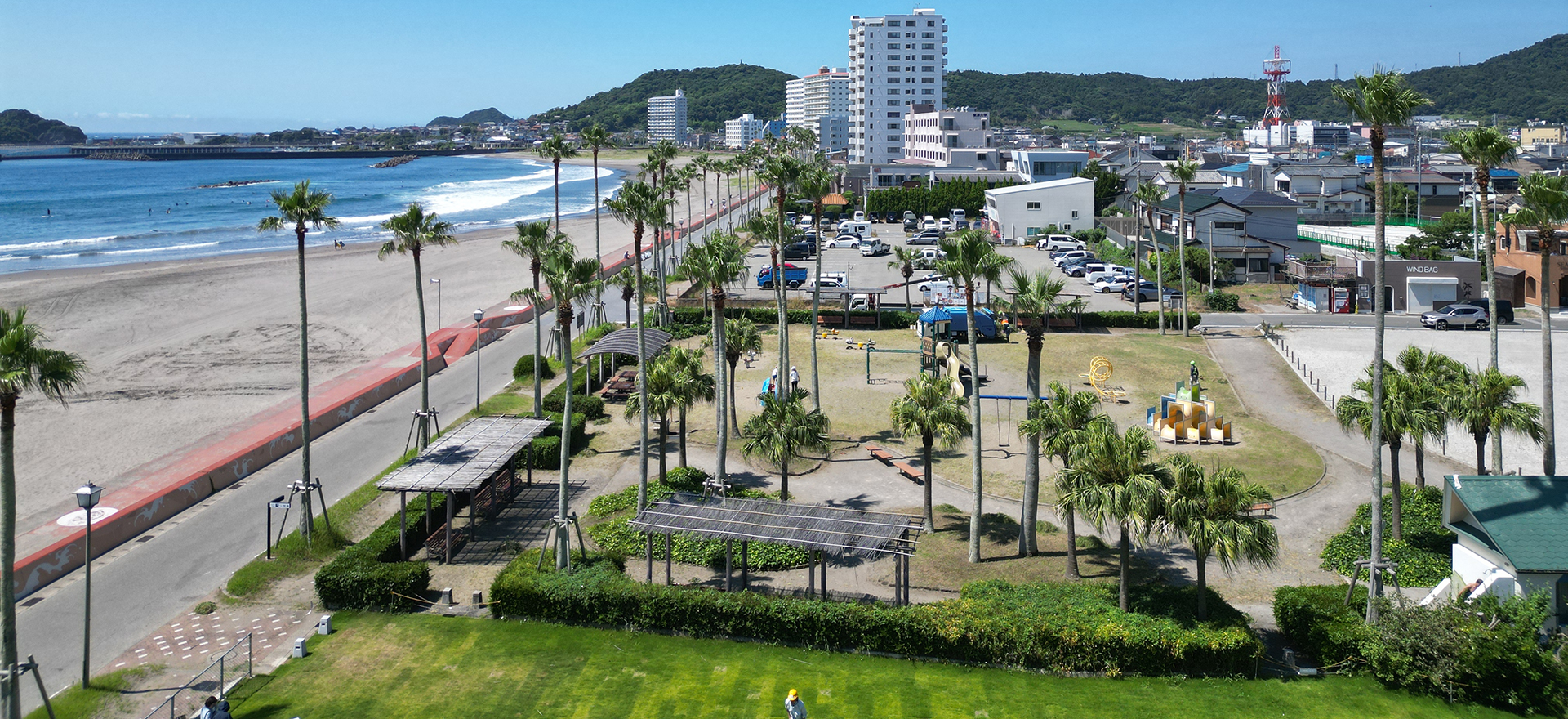 日本の渚百選の一つ「前原・横渚海岸」に沿ってつくられた景色が良い公園です。前原海岸沿いに続く約1kmの海岸遊歩道があります。ジョギングやサイクリング、散策する人の姿も多く見られます。