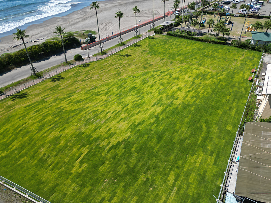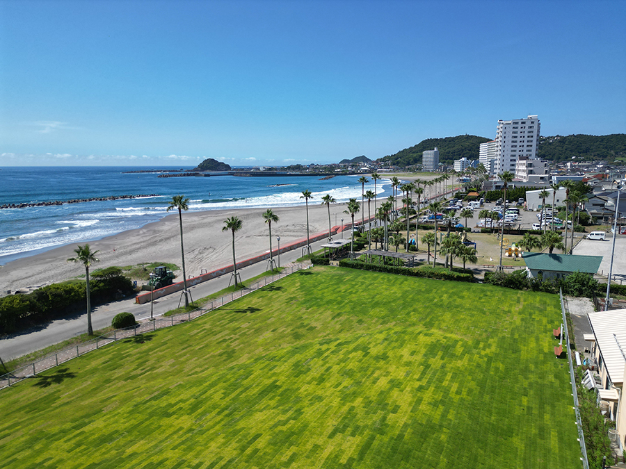 広大な敷地には美しい芝が植えられ、目の前には日本の渚百選に選定される美しい前原・横渚海岸が広がります。ベンチもご用意していますので、海岸プロムナードをお散歩した後の休息場としてもご利用ください。リードをつけていれば、犬を連れて入ることも可能です。