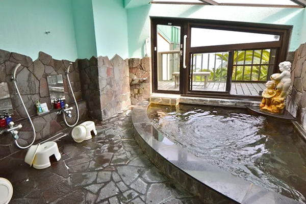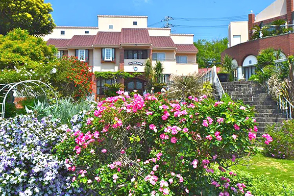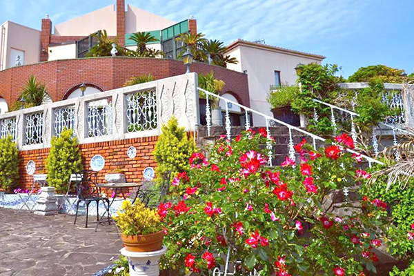 日本百景の鴨川松島と、伝説の島「仁右衛門島」を見下ろす高台に建ち、広い前庭と最上階の展望風呂から海一望。隣接する一戦場公園と魚見塚展望台までは徒歩6分と散策に最適。